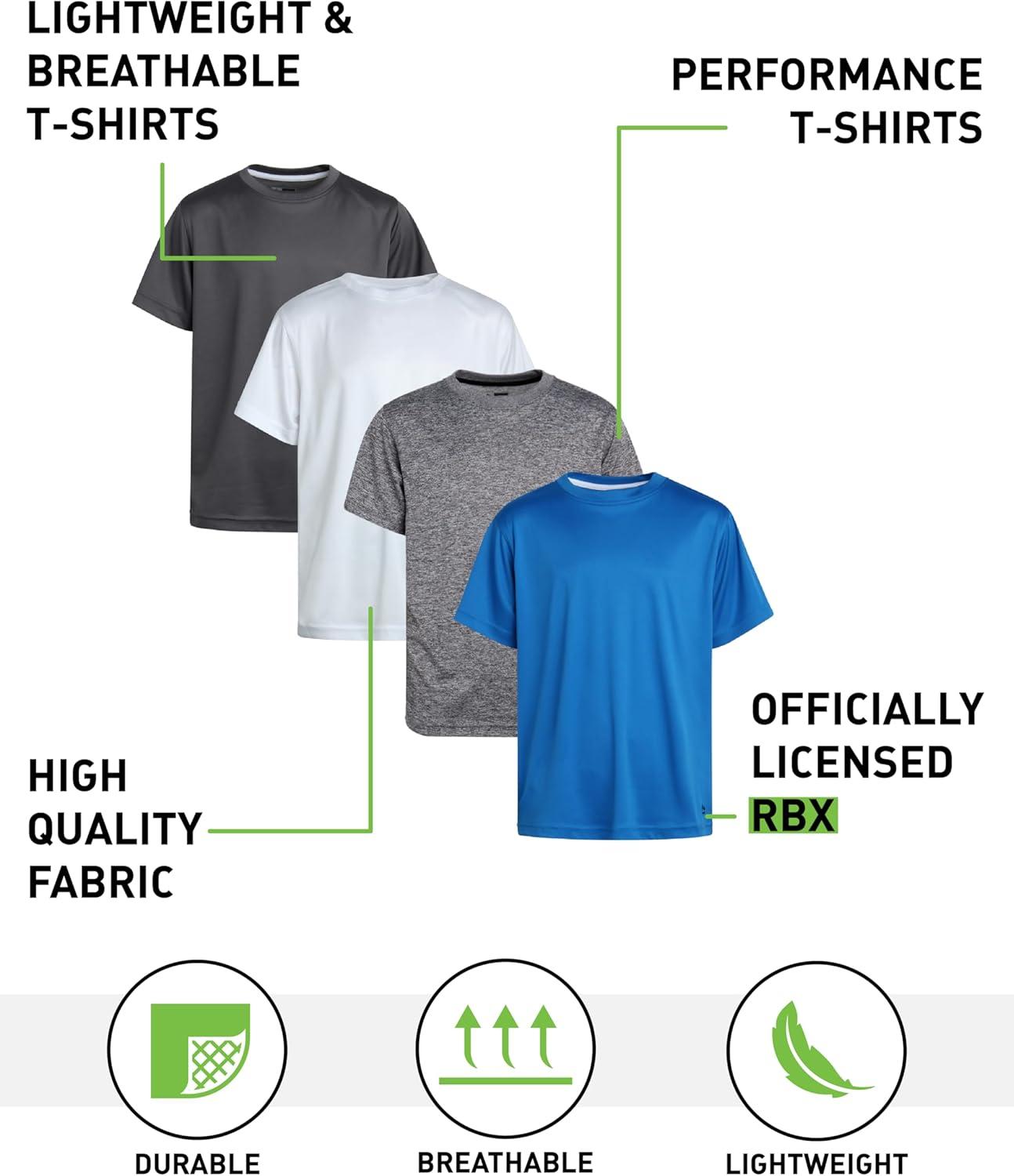 Keep your kid geared up and ready for action with the RBX Active Shirts for Boys – a 4 pack of breathable, lightweight, and comfortable fitness clothing essentials. Whether your son, grandson, or nephew is heading to practice, school, or just playing in the backyard, these short sleeve tshirts are built for his every move. With easy stretch and soft-touch fabric, they deliver all-day comfort that keeps up with his pace – from running laps to relaxing after the game. Made for those high-energy days, this 4-pack set is the perfect mix of everyday summer clothes and performance gear. Each boy t shirt is tag-free for less fuss and more focus. The breathable design ensures he stays cool whether he's in PE, climbing trees, or playing baseball with friends. And thanks to the classic crew neck fit, they layer easily under hoodies or jackets for year-round wear. These boys shirts are the low-maintenance, high-comfort essentials parents love and kids actually want to wear. Available in a variety of colors that match with anything, this pack of plain and fun-tone tee tops makes outfit planning simple. Whether your kid is a future MVP or just likes to stay comfy while repping his favorite t-shirts, this set brings versatility without the stress. Great for teens, youth tshirts sizing ensures a reliable fit for big boys' wardrobes. Stock up on the staples that handle anything – from sports and outdoors fun to everyday life. These shirts are made to move, made to last, and made for the boys who do it all.